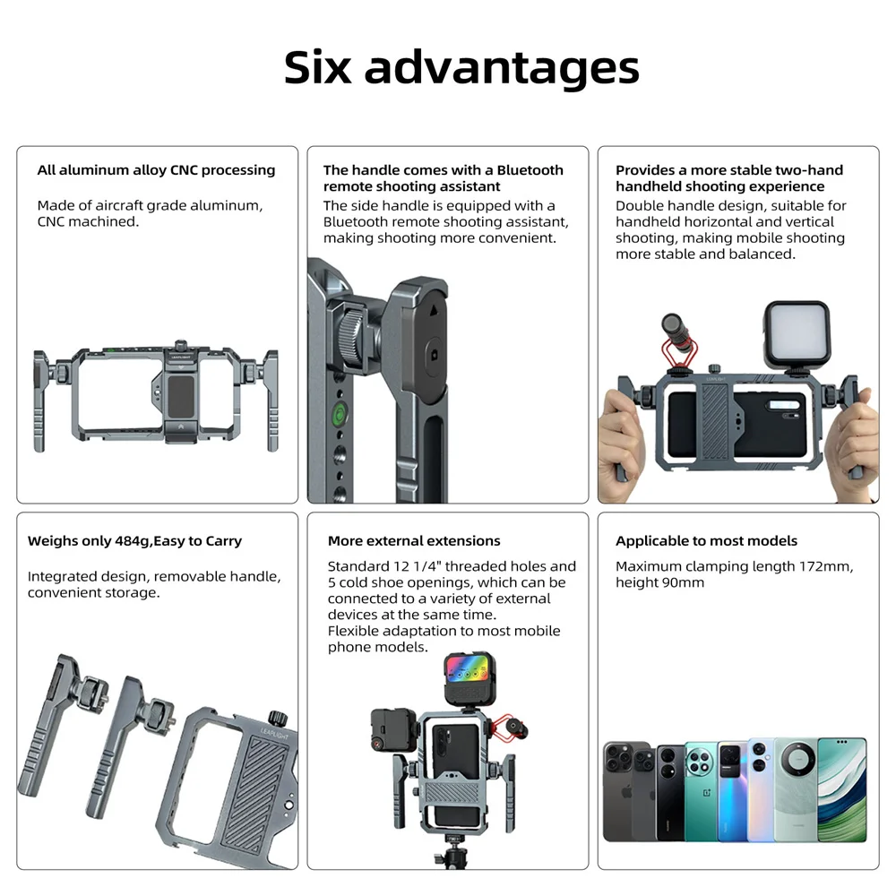 2026 New Remote Contol Smartphone Cage Video Rig W Handle Grip for Iphone 15 14 13 12 Android Phone Mic Light Photography Vlog