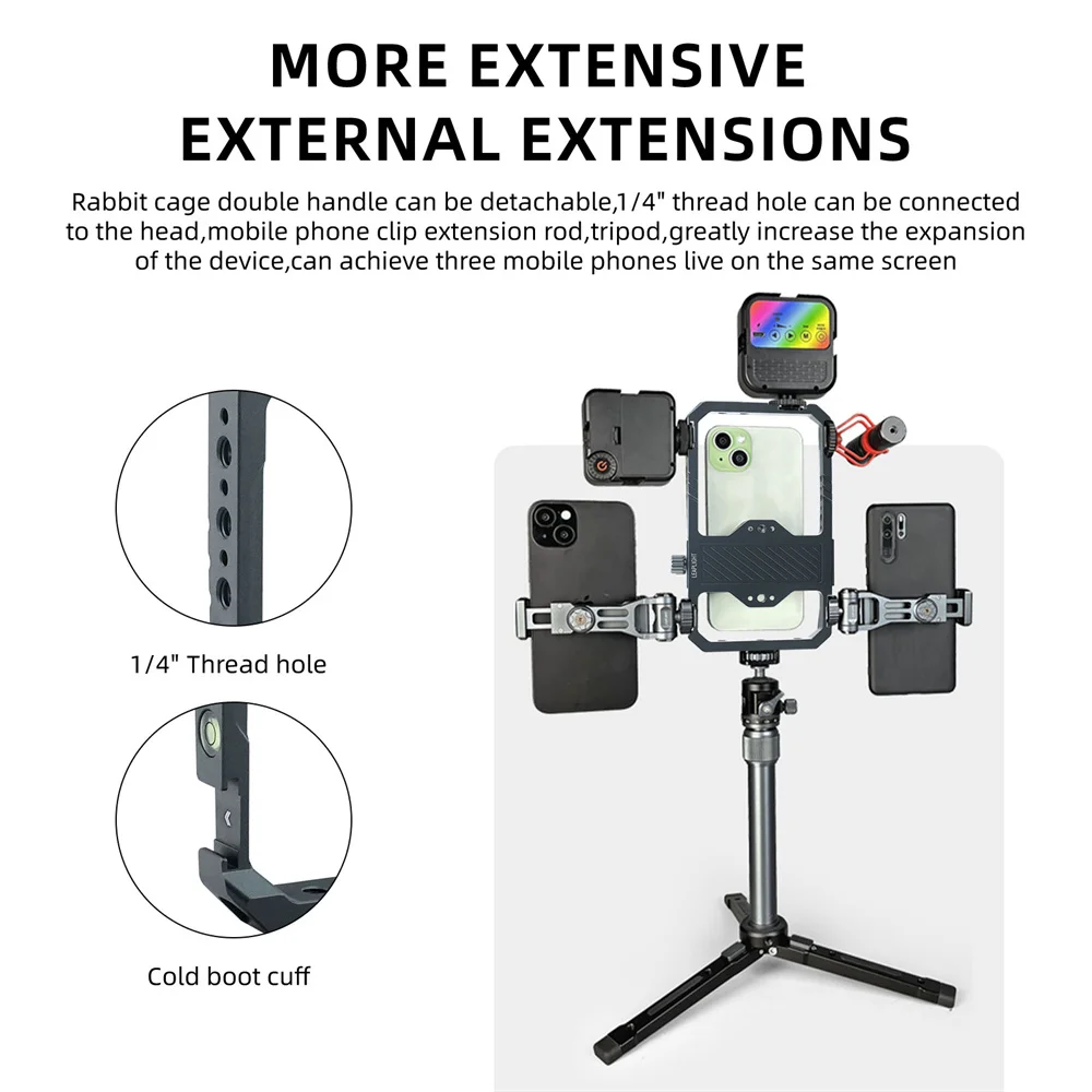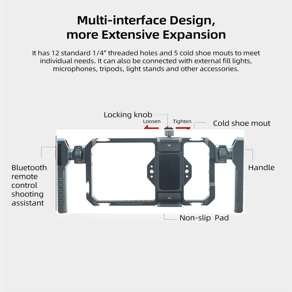 With 12 standard 1/4'' threaded holes and 5 cold shoe ports, this phone cage offers abundant external expansion options