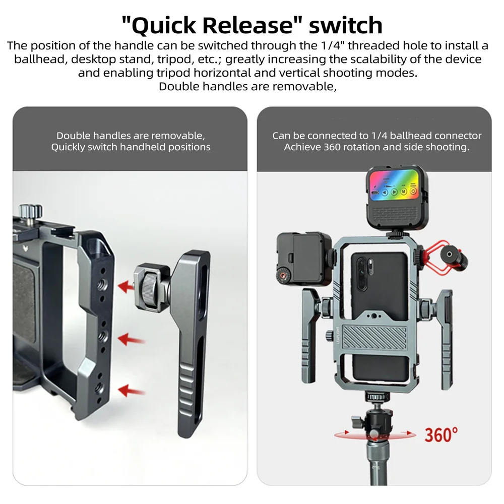 Additionally, The detachable dual handles enables you to switch the handheld position and achieve tripod horizontal and vertical shooting modes
