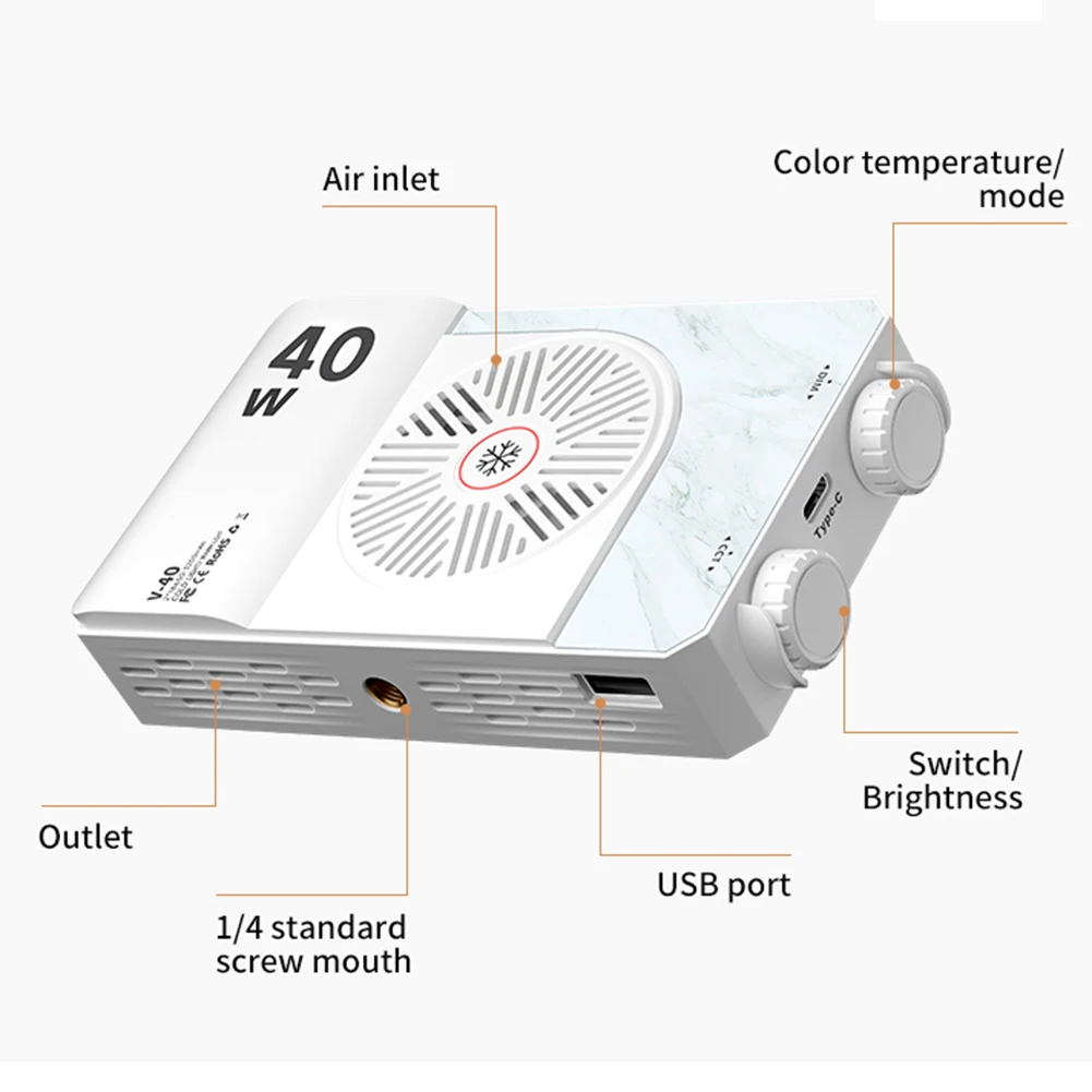 | 40W LED Camera Light 2800K-9000K Handheld Fill Light 4400mAh Rechargeable Photography Lighting Portable Light Panel for Photography Features: 1.Professional LED Camera Light: The new VL49 LED video light contains 120 ultra-wide-angle COB lamp beads, making the entire scene brighter and clearer. 2.Adjustable Color Temperature: Freely adjust color temperature with support for 2800-9000K to meet the needs of various scenes. 3.Flicker-Free Photography Lighting: No flickering ensures professional-grade photography, high color rendering restores true colors. 4.Eight FX Special Effect Modes: Simulates various life scenes, allowing for more interesting and creative photoshoots. 5.Long Battery Life: Equipped with two 2200 mAh high-capacity batteries, the portable light panel lasts up to 1200 minutes. Specification: Origin: Mainland China Size: 127.00x77.00x26.00mm/5x3.03x1.02inch Main functions: outdoor portable photography/camping/mobile phone fill light Material: ABS plastic + acrylic light-transmitting Power: built-in 40W Number of lamp beads: 120 beads 3V1W 90+ color rendering CCT color temperature: 2800-9000K Power supply: built-in battery power supply 2200*2 Charging method: Type-C 5V2A adapter Battery life: full brightness for 60 minutes, dim brightness for 20 hours Product light effect: FX8 special effects modes + white light/warm light/natural light Brightness adjustment: 5%-100% Fixed interface: 1/4 screw thread Note: 1 x Camera Light |