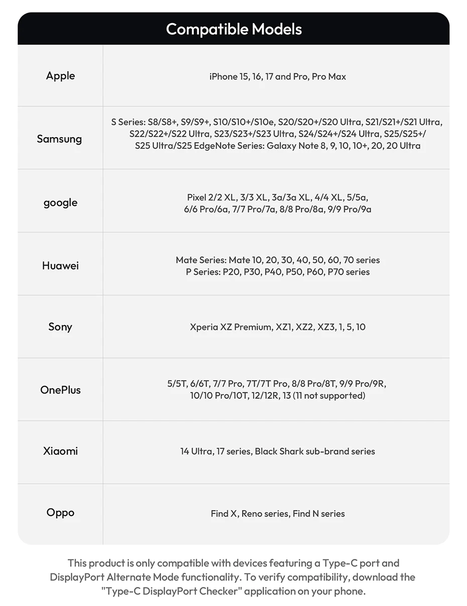 Video Transmission Protocol: DisplayPort (DP), phones that supports DP Alt Mode